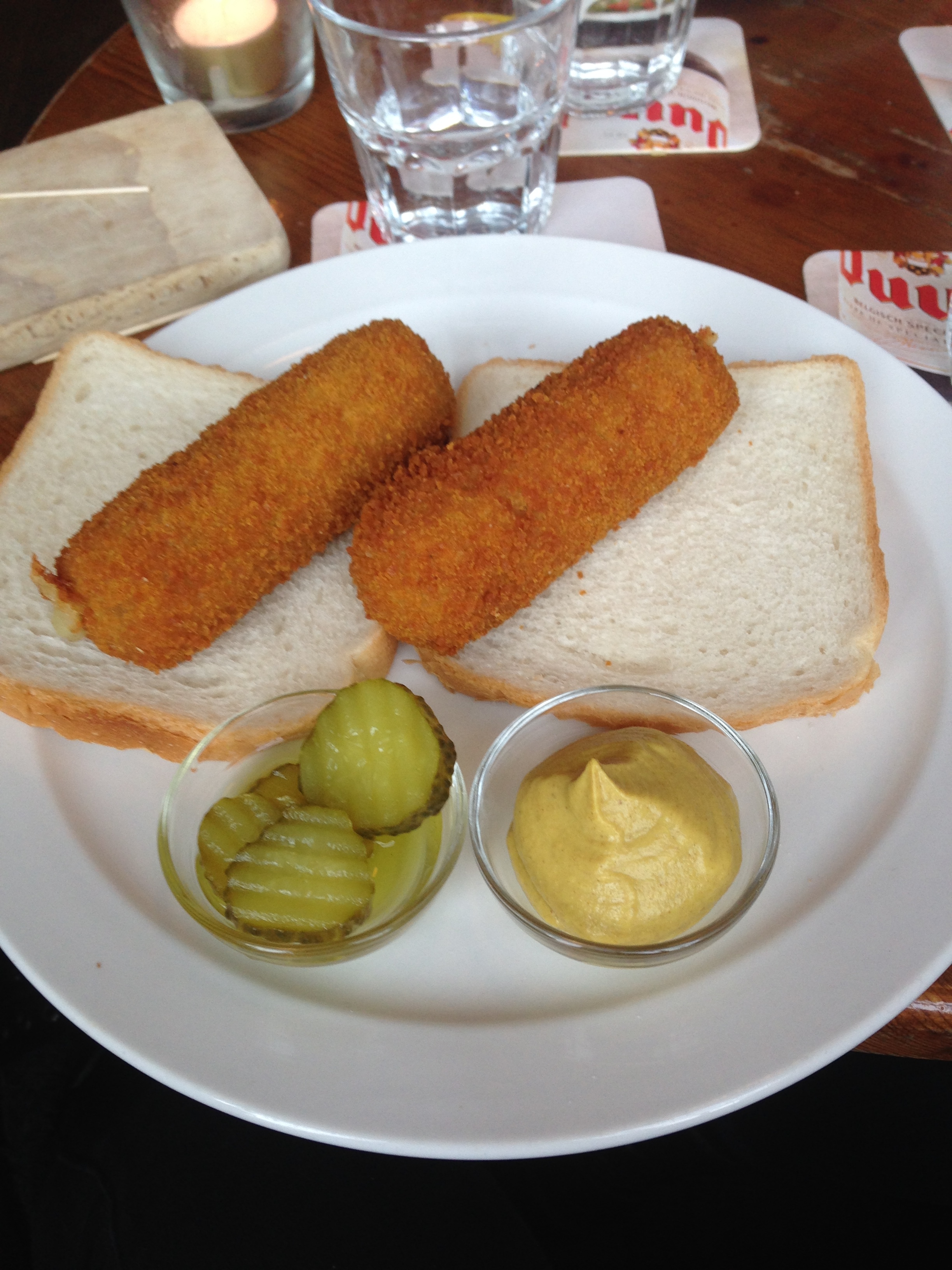 Then we went for a stroll on the canals down to a local cafe. I decided to be risky and order something that was in Dutch with no explanation of what was inside. What appeared on my plate looked like an oversized mozzarella stick on white bread served with pickles. The dish was called Kroketten and consisted of creamy potato and minced chicken in a fried roll. (YUM!) We also order an appetizer of gouda and spicy mustard. Let’s just say that did not last long either!