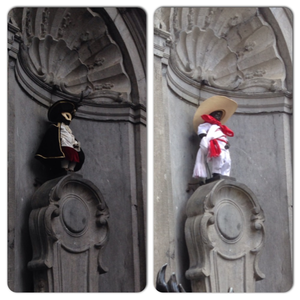 Then we headed onwards to see the Manneken Pis (or that statue of a peeing boy). The boy is always dressed up for an occasion. When we went he happened to be dressed for Carnival, wearing a cape and mask. When we went back on Monday he was dressed as a cowboy. (No idea on the cowboy celebration)