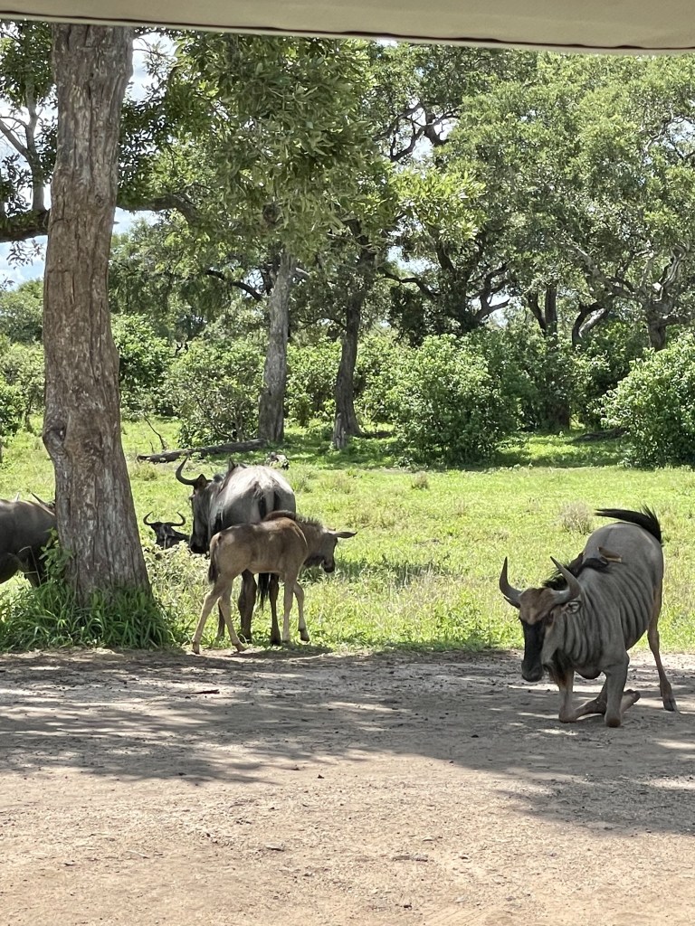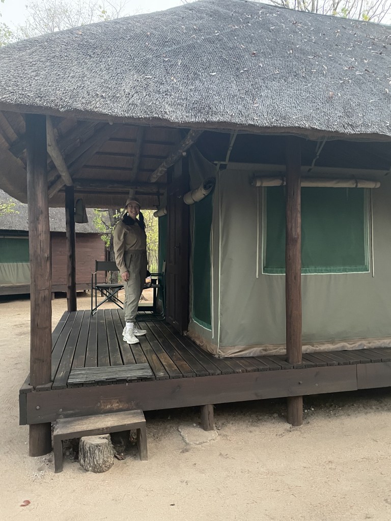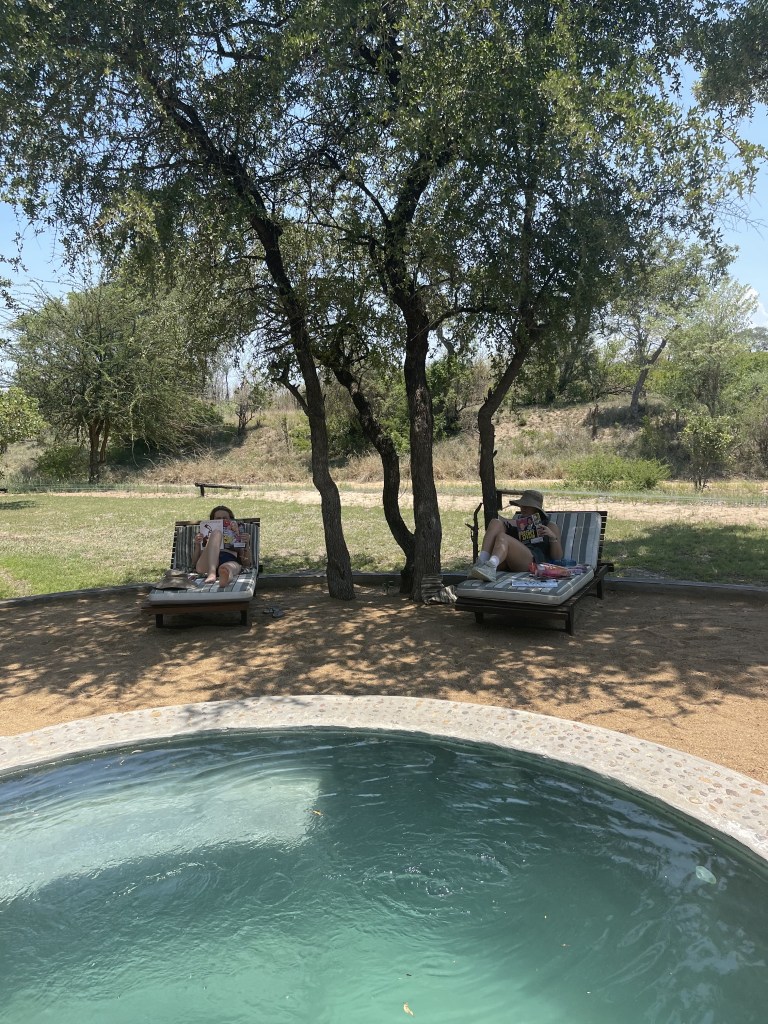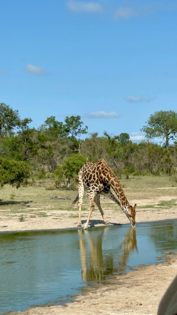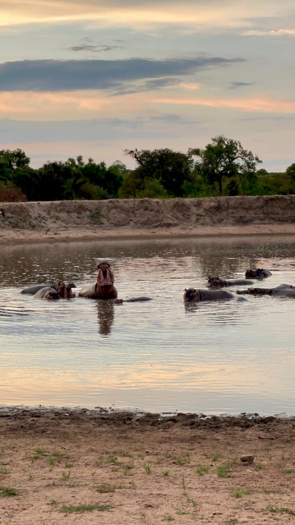 After picking up a copy of “Skatolog ” at the Kruger gift shop, it was time to head deeper into the bush to our new lodge at Shindzela. This was also a glamping situation, but more of an outdoors feel with outdoor showers. Truly it was one of the coolest experiences just even staying at this private reserve. The campsite had an electric fence surrounding it to keep us safe, but in viewing distance from the pool was a watering hole, where our friend Harry the hyena would come for some sips. We stan a hydrated king.