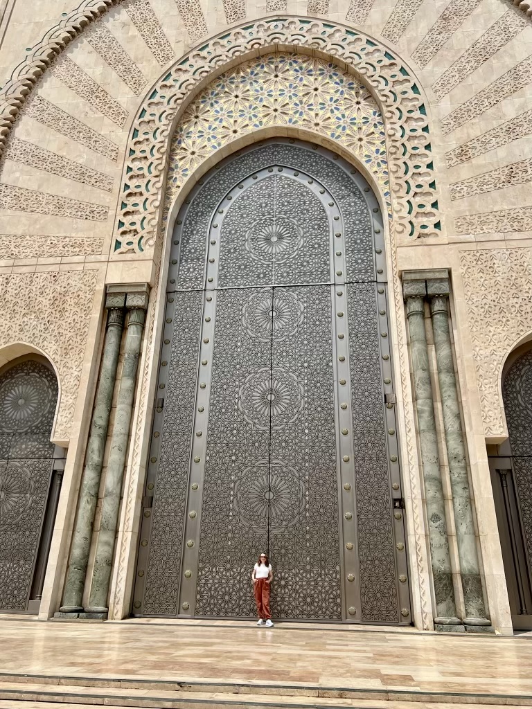 The last stop of this tour was the Hassan II Mosque, which is the second largest functioning mosque in Africa and the 14th largest in the world. All the materials used to build the mosque were made by Moroccan artisans except the lights. The green color you will notice in a lot of these buildings is linked to Islam, peace, and nature. The 3 balls on top represent the 3 major monotheistic religions (one God) – Islamic, Christianity, and Judaism. A symbol that we can all come together and we have more in common than apart. A sign of community and peace.