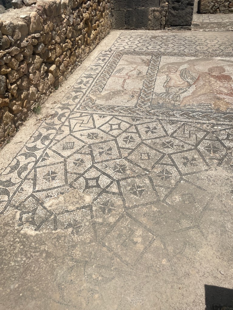 The mosaics you can see are relics of the Romans, specifically the wealthier families. Some of them still have Berber designs, while others that have faces are from the Roman period. You will notice a pattern that looks like a swastika, but at this time it has a completely different meaning. It was the Berber version of something similar to ying yang, going left to right and then right to left.